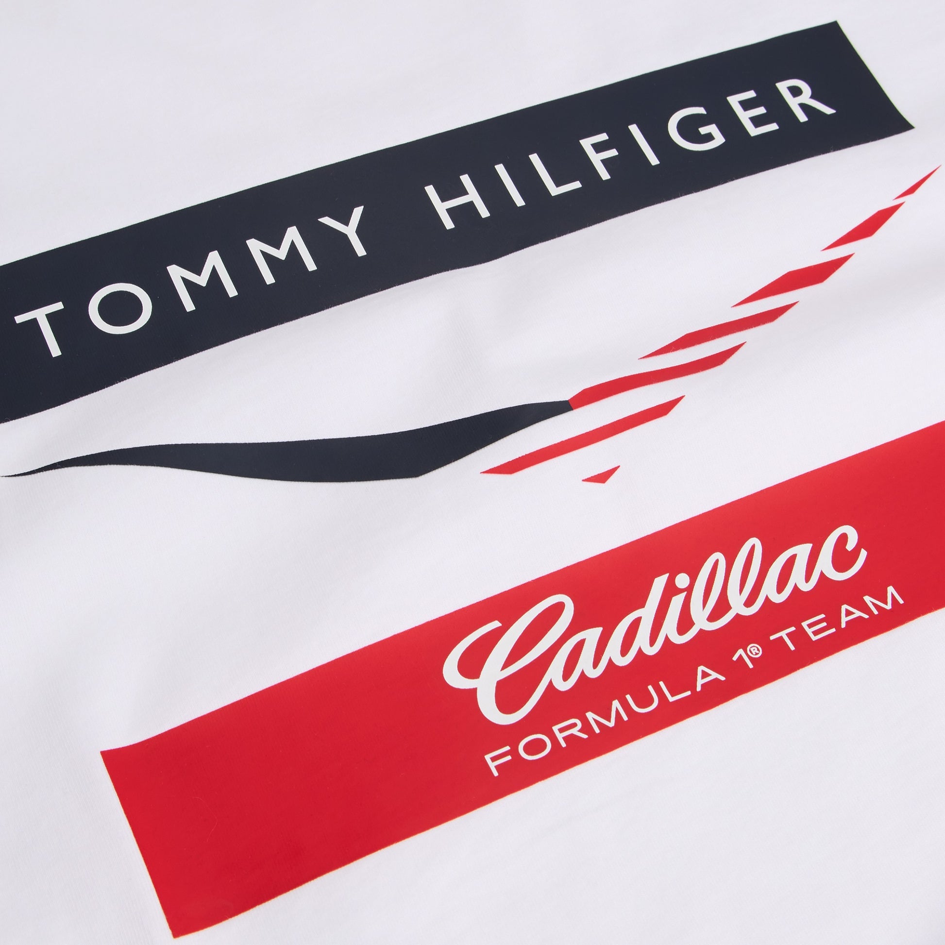 Made from soft, breathable cotton with a comfortable regular fit, it features a bold chevron graphic and official Tommy Hilfiger x Cadillac Formula 1 Team branding for authentic racing appeal.