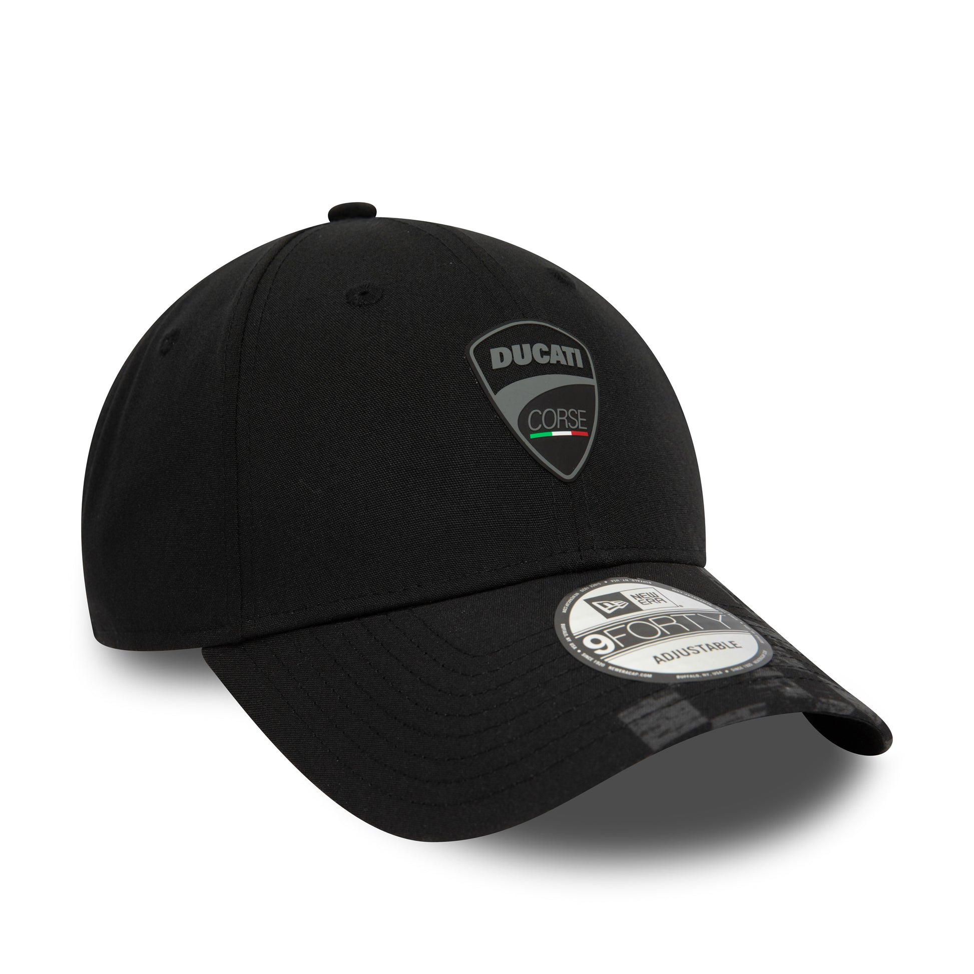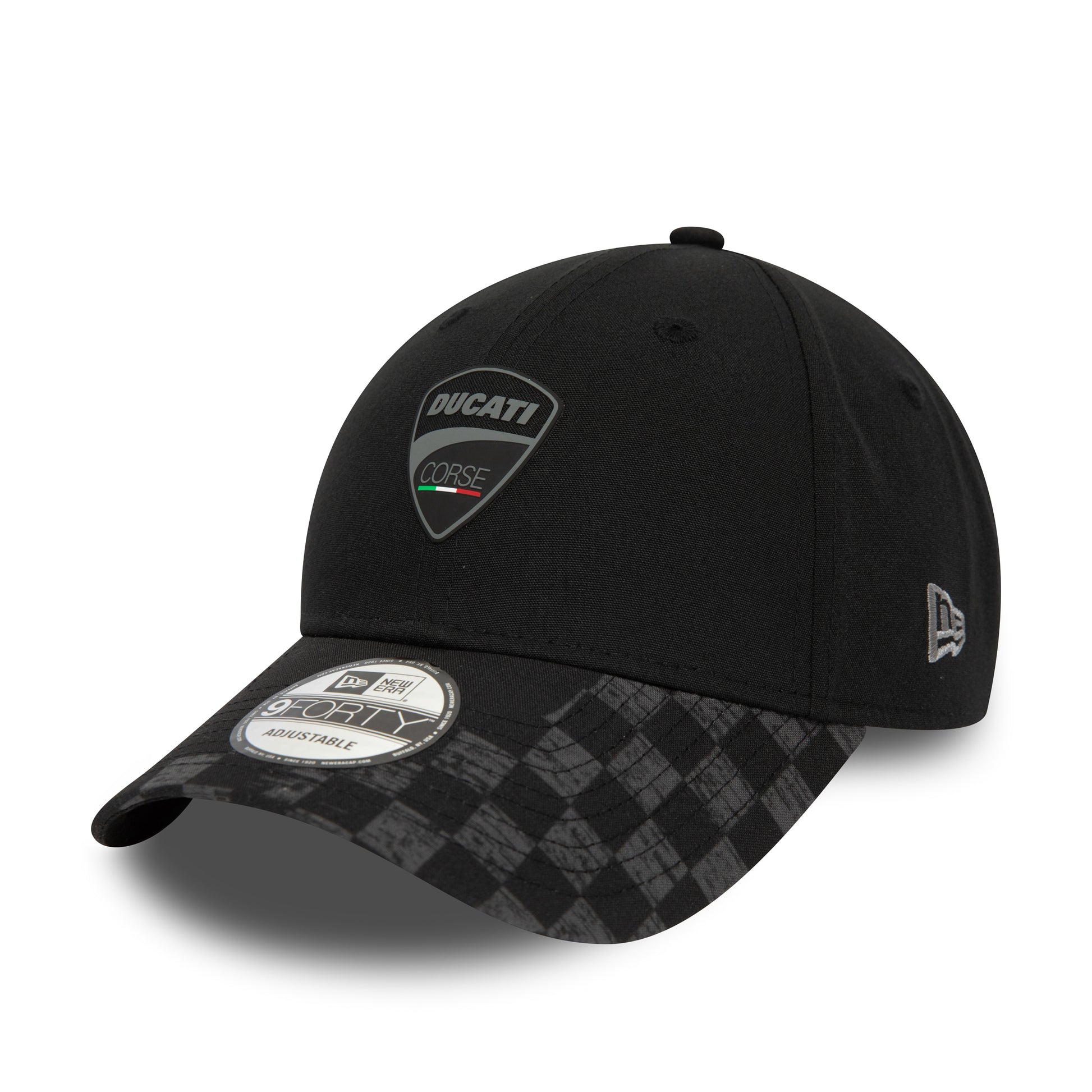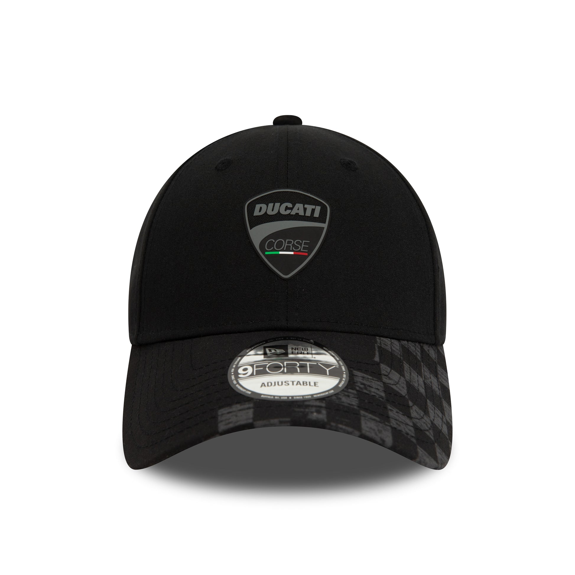 Ducati Corse logo finished in a subtle tonal black with a race inspired chequerboard pattern on the peak. This is cool and understated and we really like it. Made by and featuring the New Era flag.