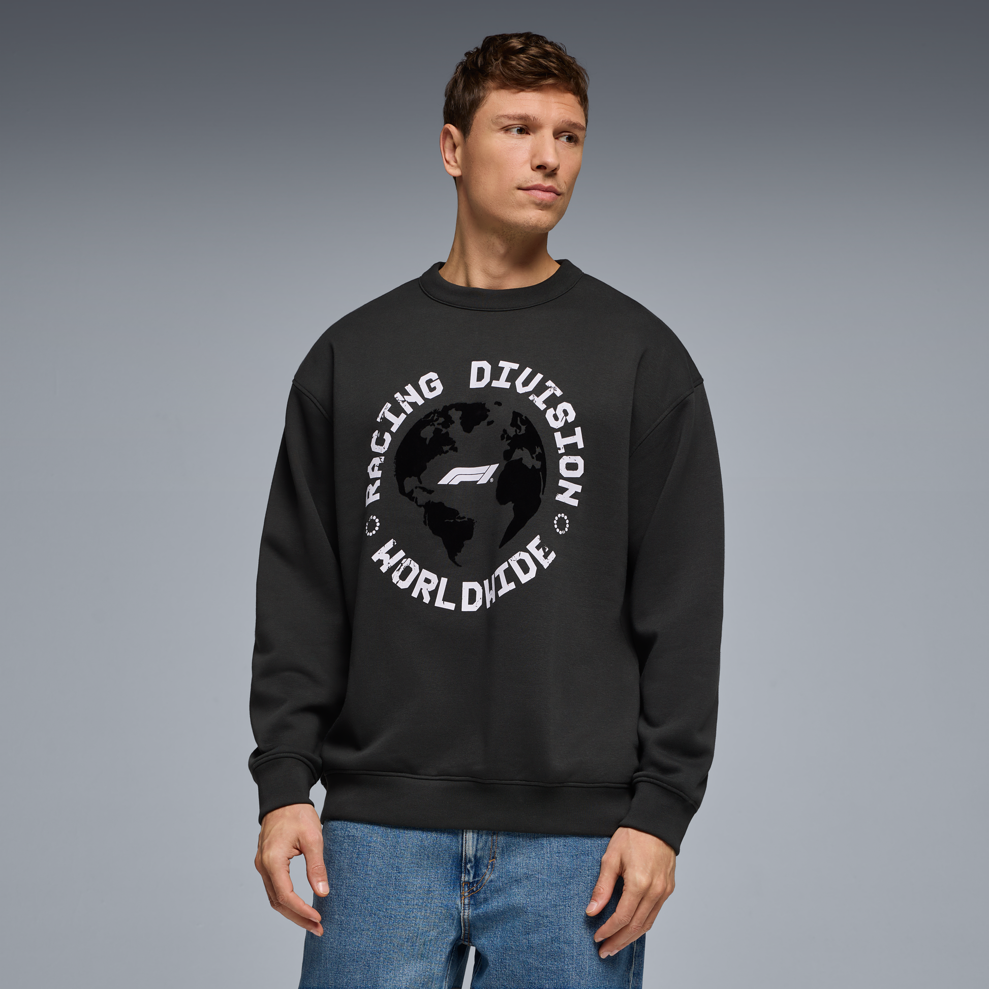 Keep it clean and classic with the F1 Racing Division Worldwide Graphic Crew Shirt for men in Pirate Black. Featuring official F1 logo branding and a comfortable everyday fit, this Crew top is ideal for race weekends, casual wear, or showing your love for Formula 1 all year round.