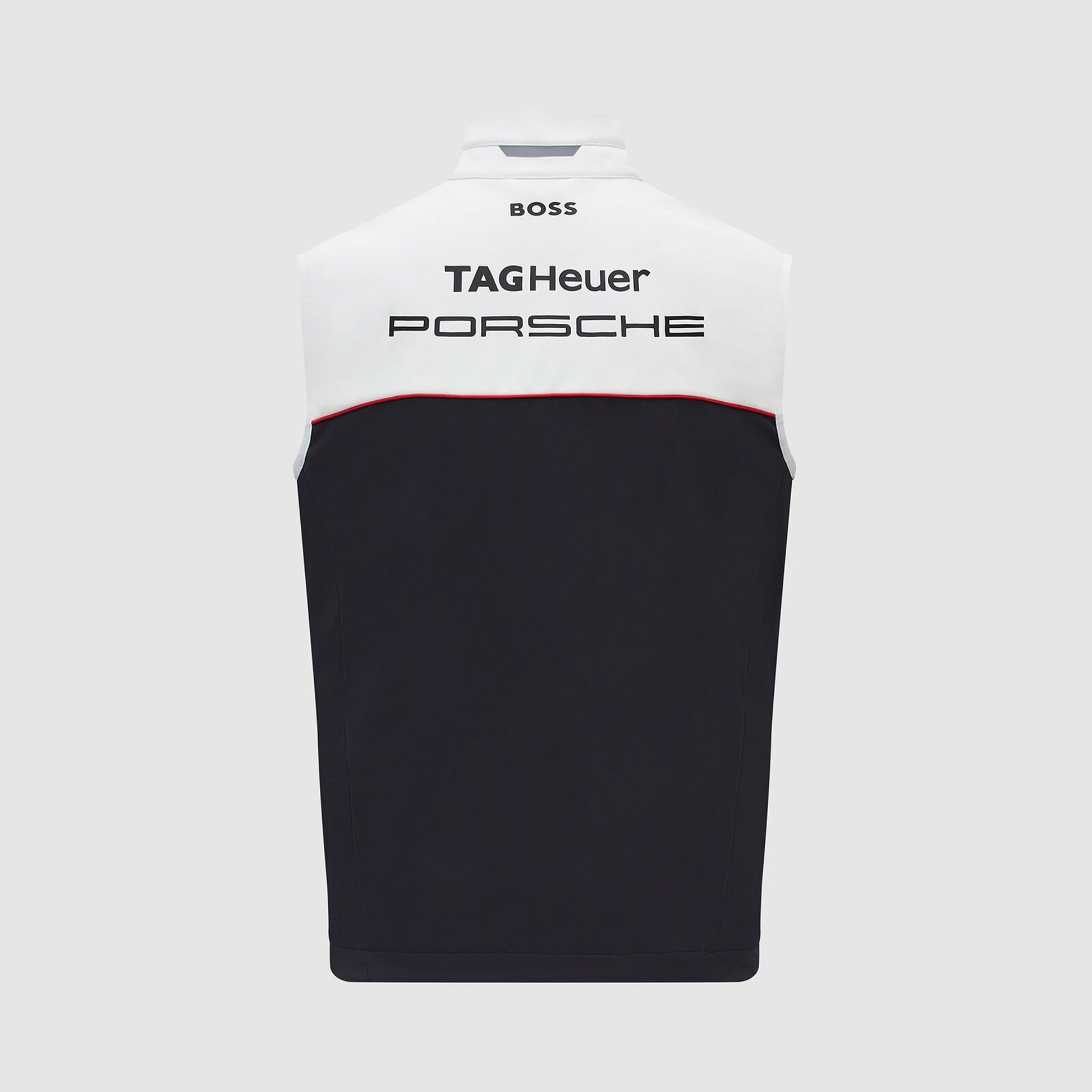 Porsche Formula E Team Gilet. Black and White colourblock design with team and partner logos. As worn by the Porsche Motorsport Formula E Team. Water repellent, with reflective taped collar, cuff and back. Handy glasses wipe cloth hidden inside pocket.