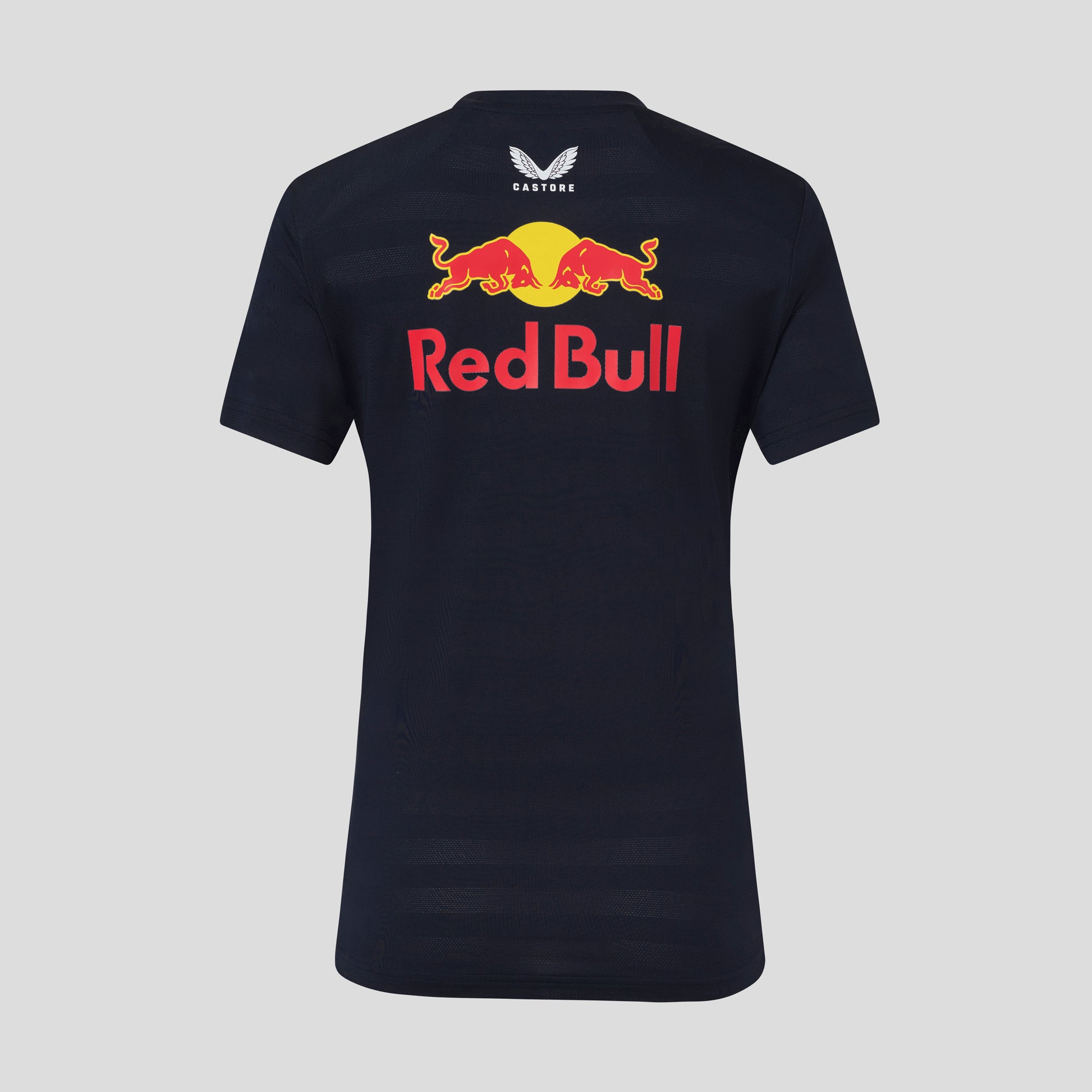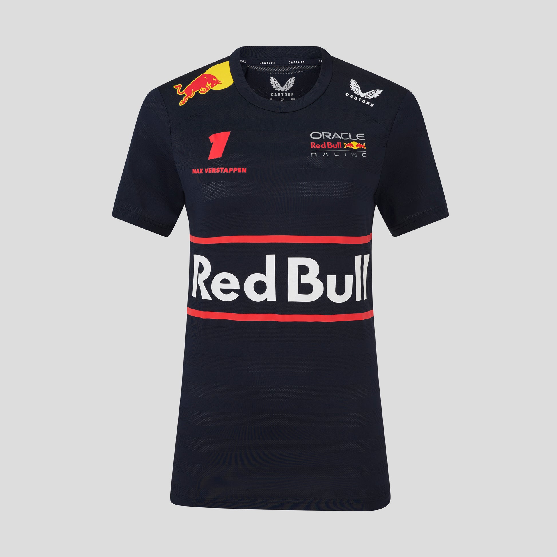 Oracle Red Bull MV F1 Driver Racing Tee Shirt. Womens T-shirt featuring Max Verstappens Formula 1 racer number "1". The back of the tee features the iconic charging Bulls logo.