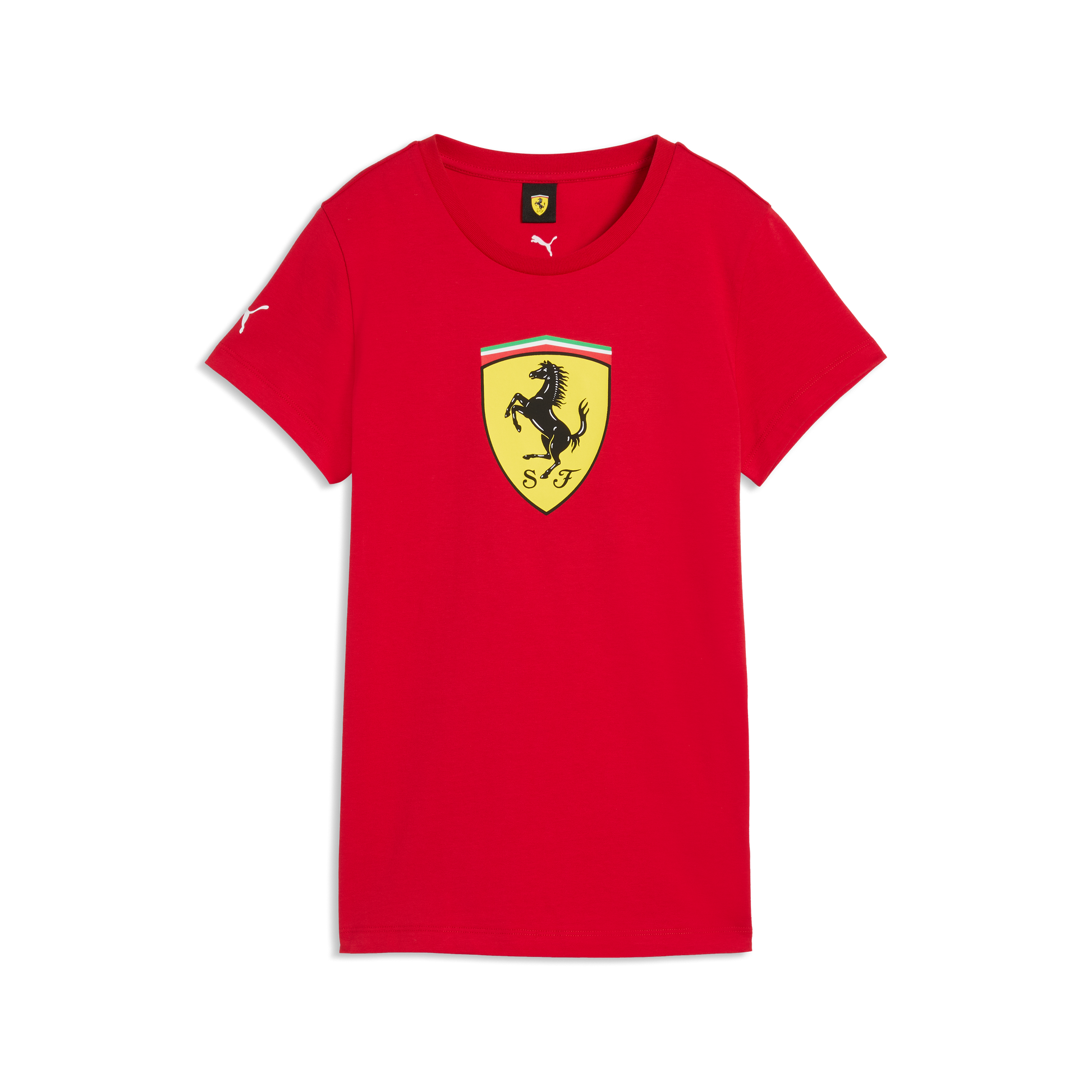 Show your Ferrari pride with the Scuderia Ferrari F1 Shield Tee for women in Rosso Corsa. This official team T-shirt features a classic crew neck, flattering fit, and bold Scuderia Ferrari F1 shield branding, perfect for race days, casual wear, or motorsport-inspired everyday style.